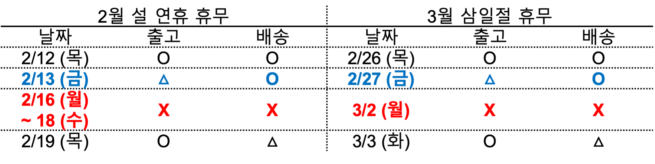 2월 설 연휴 및 3월 삼일절 배송 일정 안내